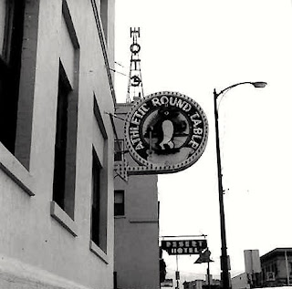 | Outside entrance and parking lot of the Athletic Round Table on the west side of the Desert Hotel facing First Street – The parking lot eventually gave way to a pool and outside bar |